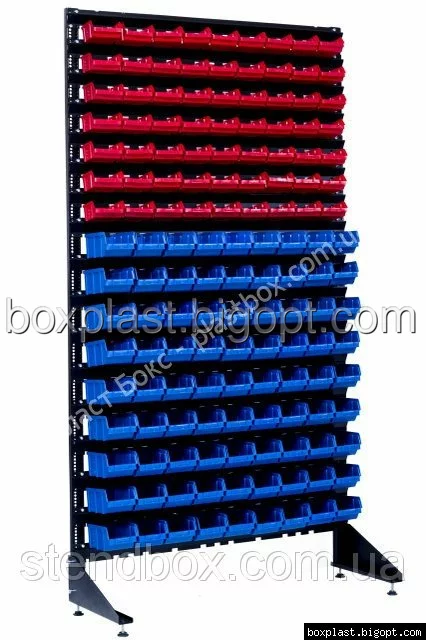 Напольный пристенный торговый стенд с пластиковыми ящиками